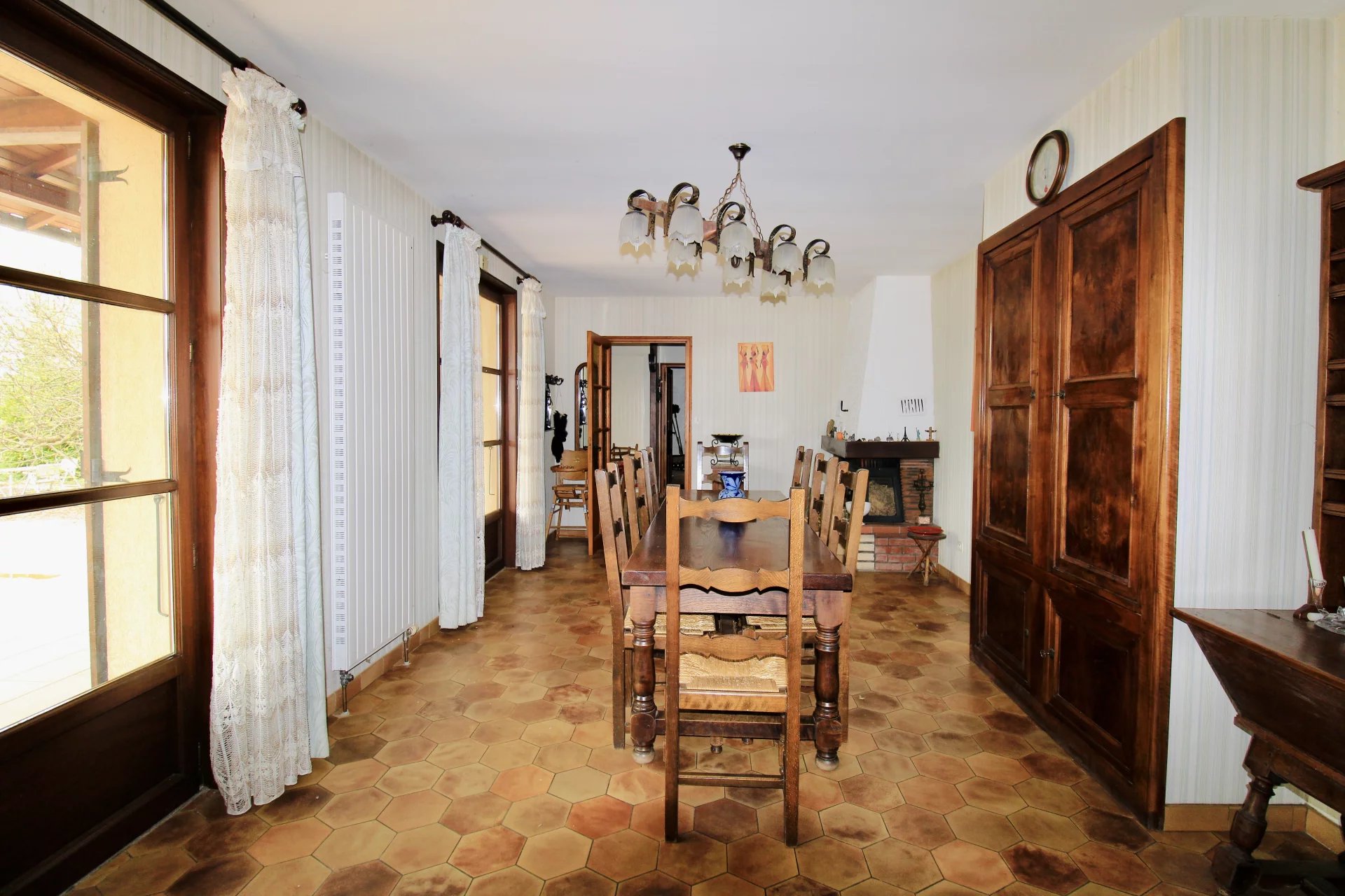 Le rez-de-chaussée est composé d’une cuisine équipée de 25m2 donnant sur une salle à manger avec poutres apparentes et cheminée conservant ainsi tout son cachet et communiquant avec un salon de 37m2 équipé d’un poêle à granulés.