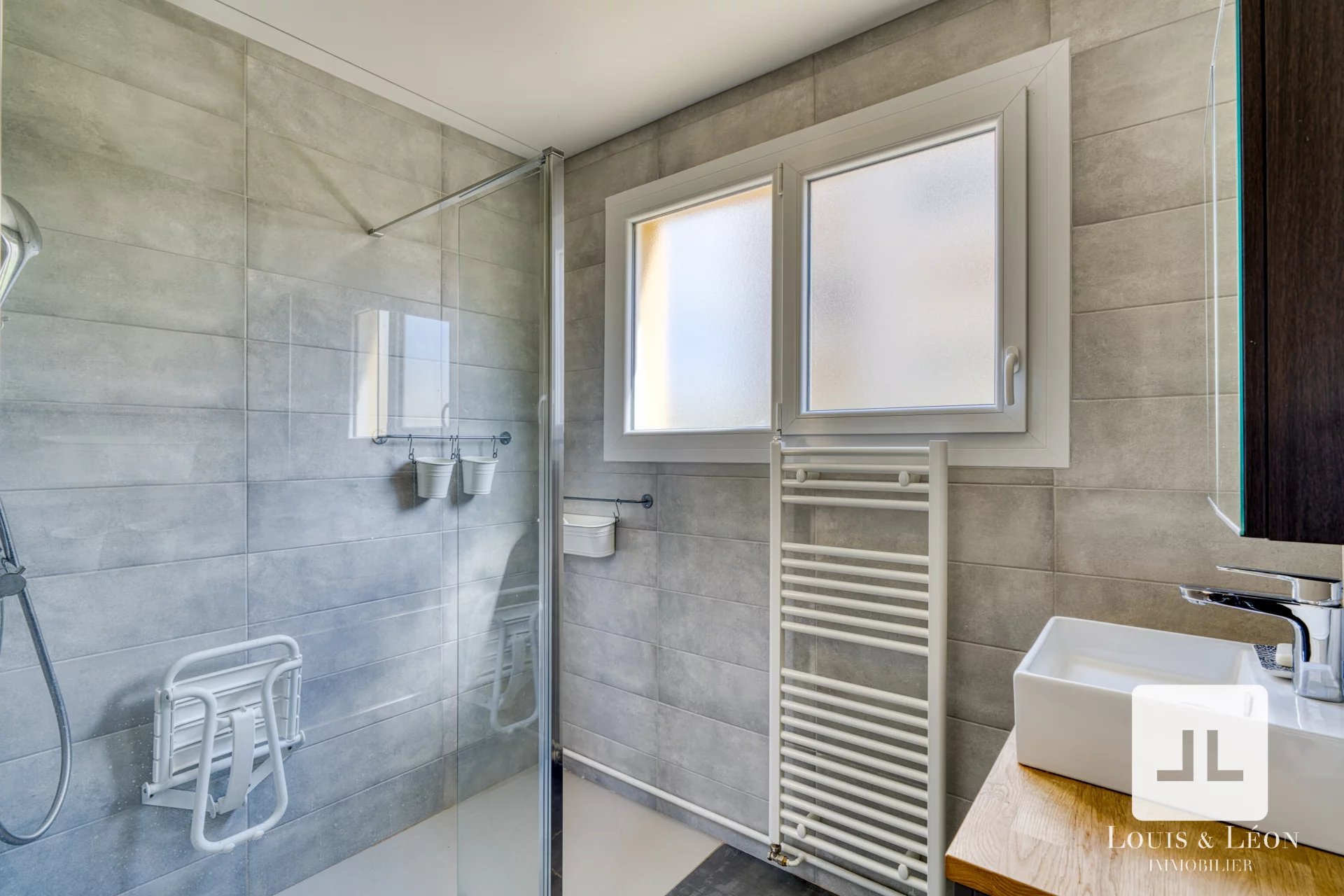 La salle d’eau, entièrement rénovée, offre des prestations modernes et élégantes.